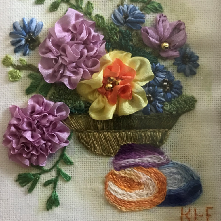 Man broderar med Sidenband eller en blandning av siden och konstfiber samt moulinegarn. Egen design eller på förtrykt mtrl.